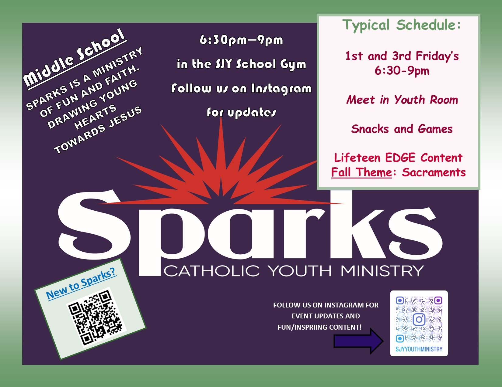 SPARKS is a ministry for young people in grades 6-8. While it is sponsored by St. Joseph Parish, it is open to anyone, Catholic or non-Catholic. The mission of SPARKS is to combine FAITH with Fun so that our young people experience the joy of community and a relationship with Jesus Christ through the Church.